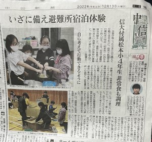 災害が起こった際に自ら考えて行動できるように、信州大学教育学部附属小学校の四年生が同校で避難所宿泊体験をしました。附属小の先生と今回の企画に携わりました。松本市危機管理課と元原町会の方にもご協力を頂きました。