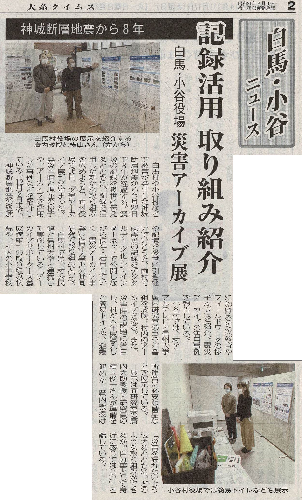 大糸タイムスに白馬村・小谷村の役場で行った神代断層地震アーカイブサポーターズ養成講座や、フィールドワークの様子など小中学生向けの防災教育に関する展示が取り上げられました。